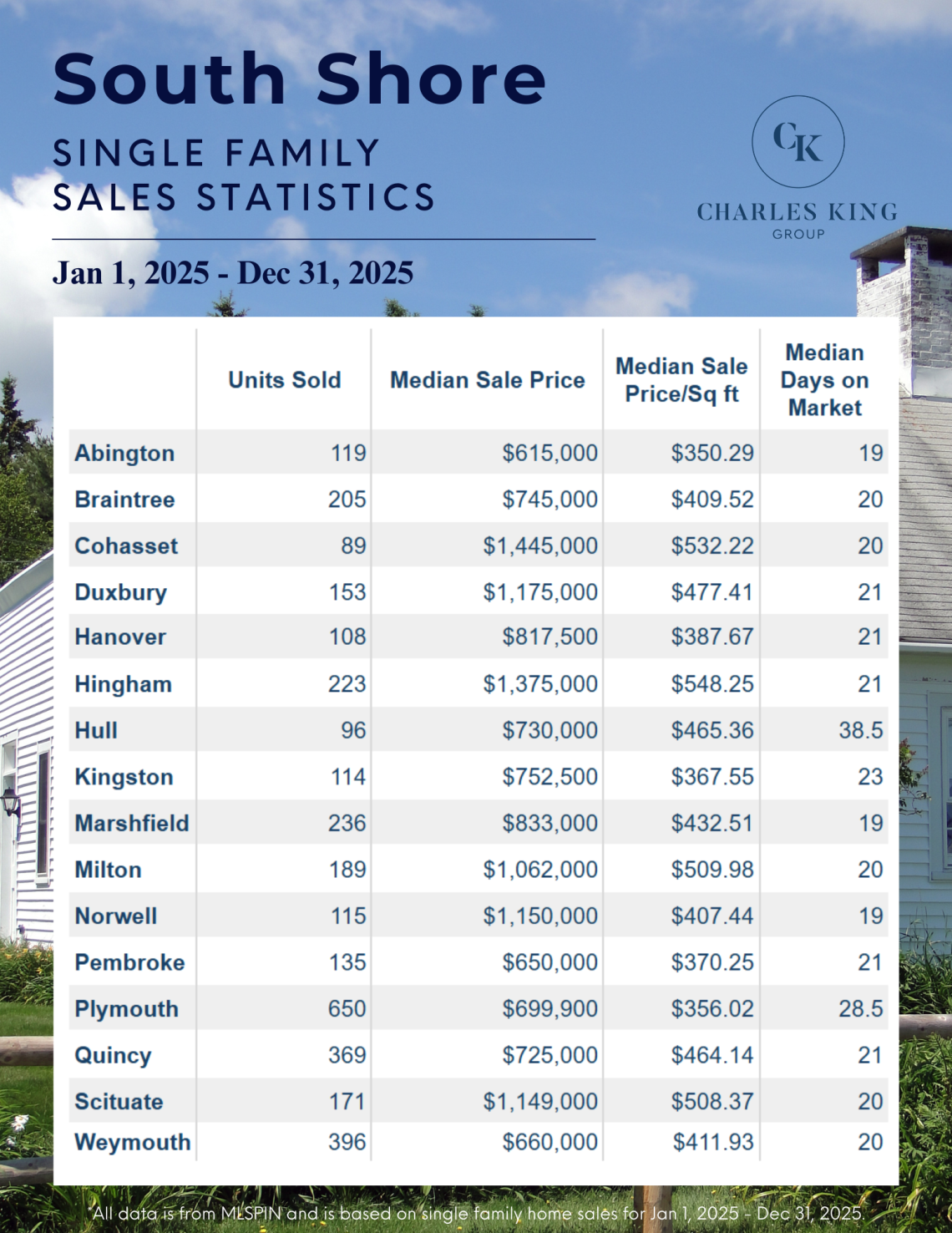 All statistics are sourced from MLSPIN and reflect single-family home sales from January 1 through December 31, 2025.