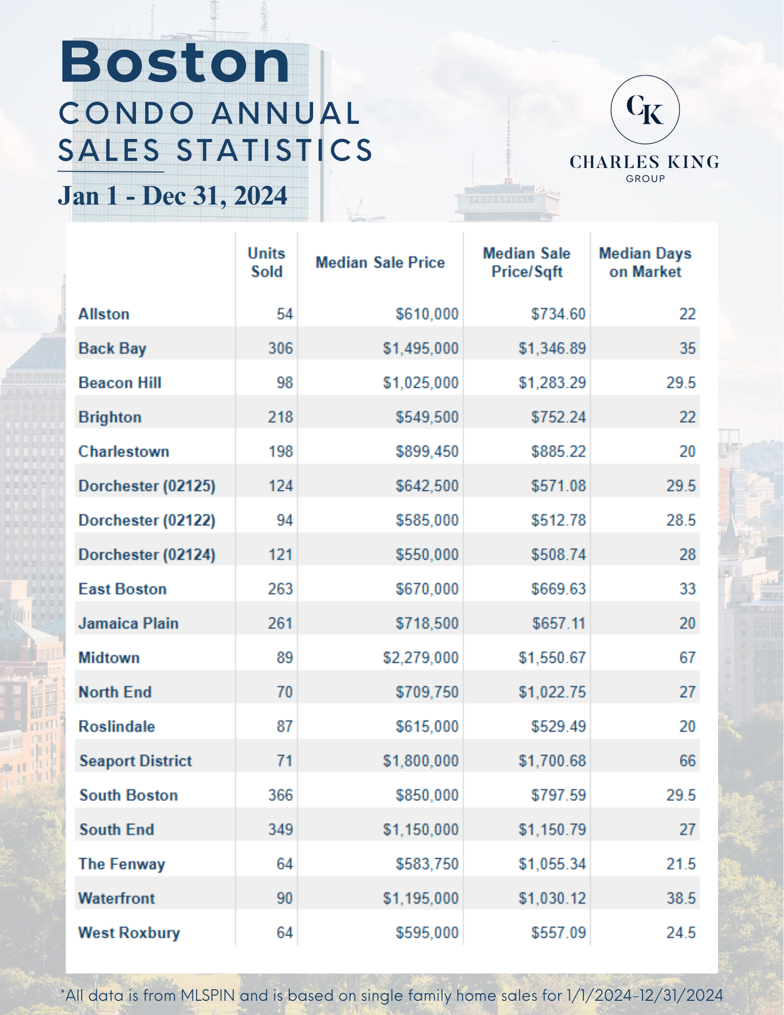 Boston remains a competitive and diverse market. Whether you’re a first-time buyer, seasoned investor, or planning to sell, this data highlights the opportunities across the city’s vibrant neighborhoods.