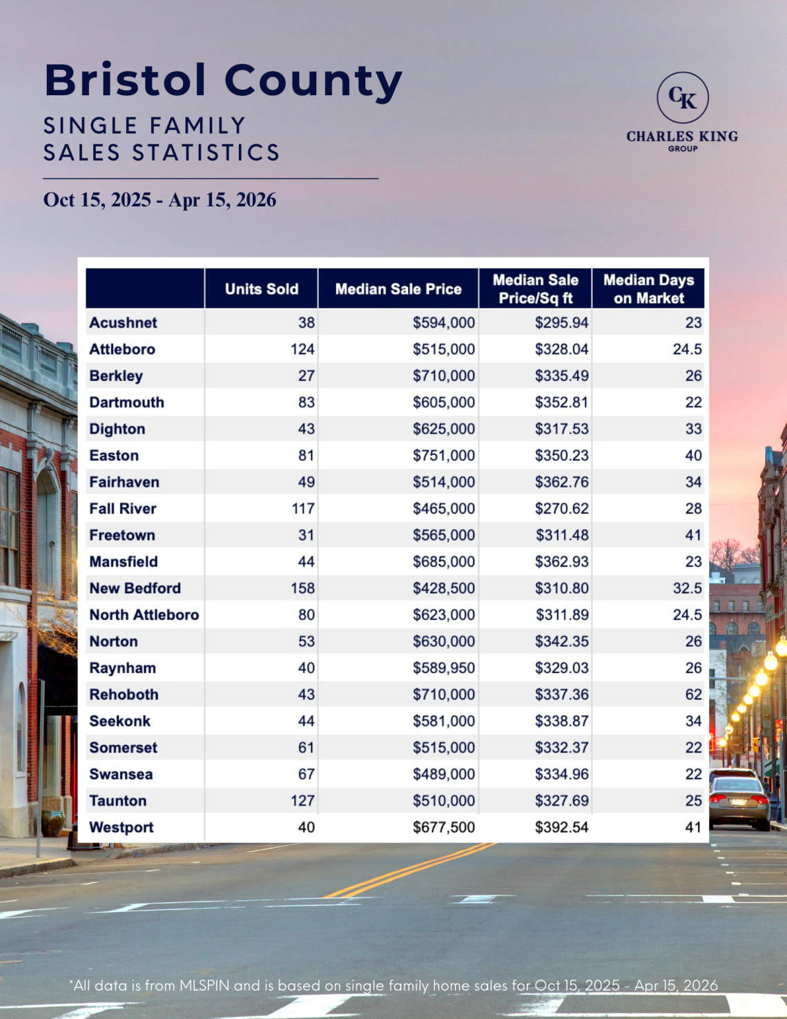All data sourced from MLSPIN. Single family home sales, October 15, 2025 – April 15, 2026. Published by the Charles King Group, Hingham, MA.