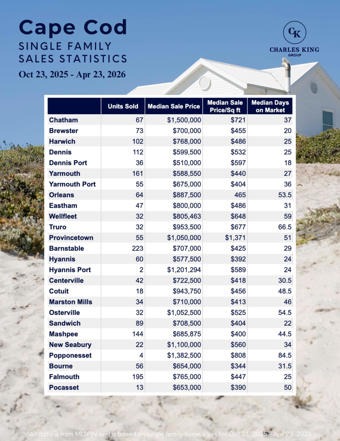 The median sale price for single family homes in Chatham is $1,500,000, the highest of any town on Cape Cod during this period. At $721 per square foot and 37 days on market, Chatham is the Cape's premier prestige market. Source: MLSPIN, October 23, 2025 – April 23, 2026.