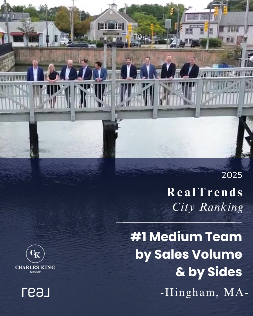 We are thrilled to announce that The Charles King Group has been honored by RealTrends as the #1 Medium Team in Hingham, Massachusetts, based on both sales volume and transaction sides. This prestigious ranking highlights our team’s commitment to excellence, client service, and local expertise.