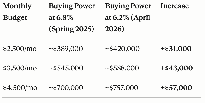 A rate drop from 6.8% to 6.2% on a 30-year fixed mortgage reduces your monthly payment on a given loan balance. Run that in reverse — hold the payment constant, increase the loan — and you get more buying power with the same monthly outlay.