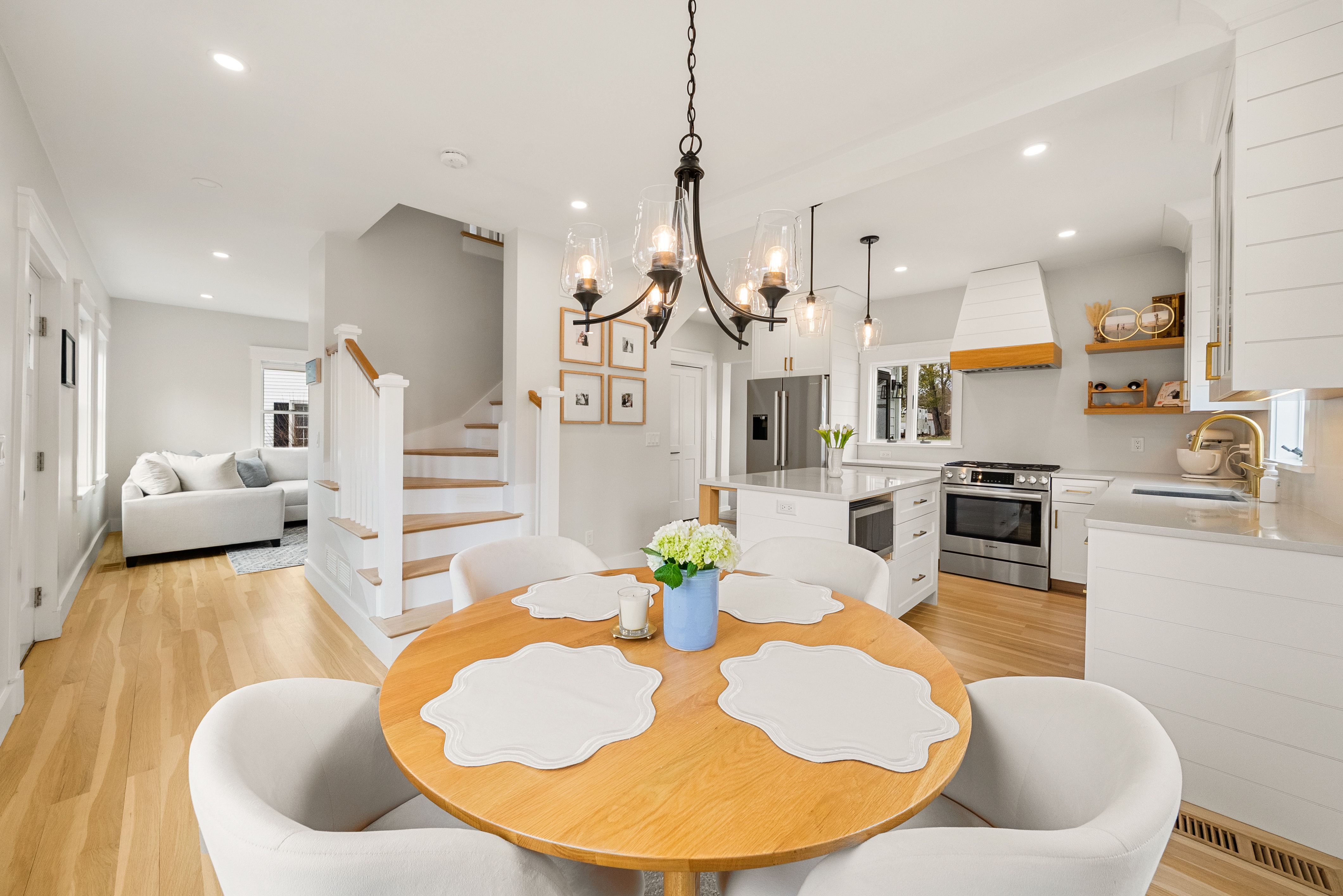 The renovation was done right. White oak hardwood floors run throughout, the layout opens up naturally from the kitchen to the living and dining areas, and the finishes throughout are clearly the result of real design decisions — not builder-grade shortcuts.